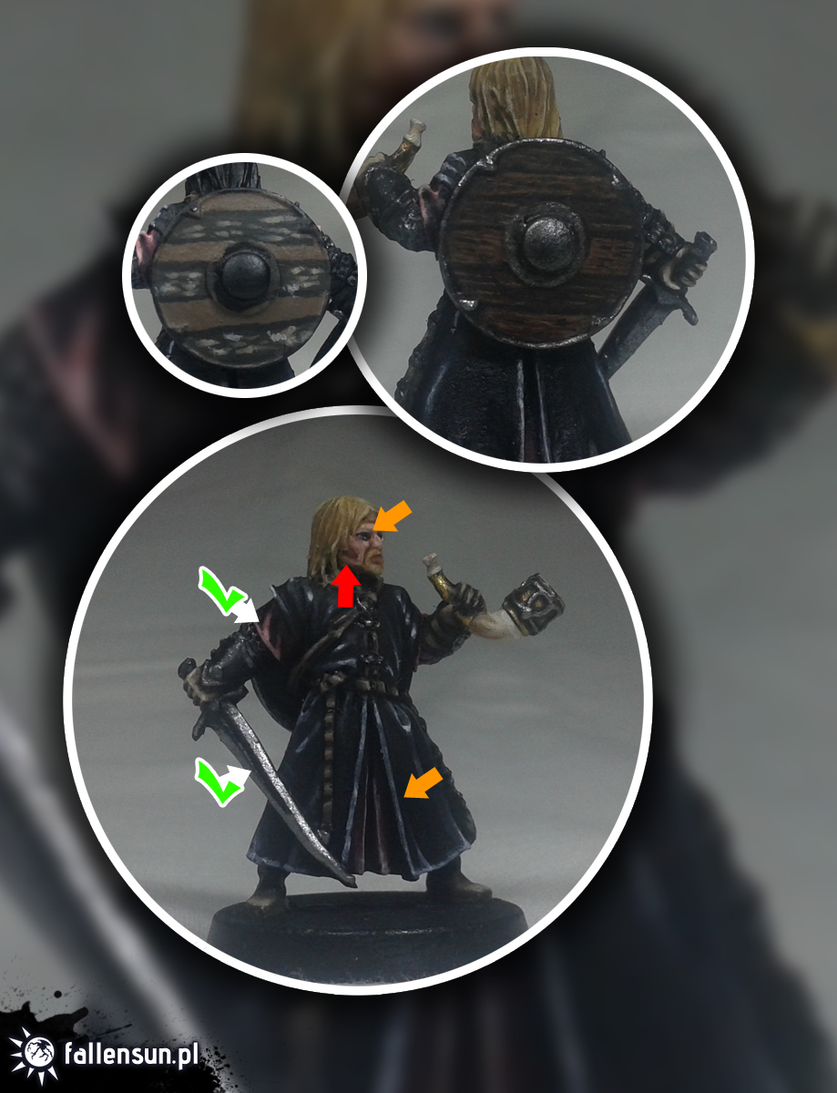 Podoba mi się mieczyk poprawiony i przejścia różowe... troszkę trzeba popracować nad białym krawędziowaniem - wydaje mi się że to jest zła konsystencja farby - za sucha - albo pędzelek nie trzymający szpicu dobrze, ale to jest do dogrania - ważne że jest estetycznie i precyzyjnie na pomarańczowo zaznaczyłem też oko... gość wygląda jakby miał mocny cień do oczu zastosowany... domyślam się że było malowane: czarna kreska biała kreska czarna kropka błękitny błysk... wystarczyło wywalić pierwszy punkty czyli czarną kreskę a zamiast tego dodać punkt na końcu - brązowy wash - dodałby idealne cienie i wyciągnął jak trzeba oko.
