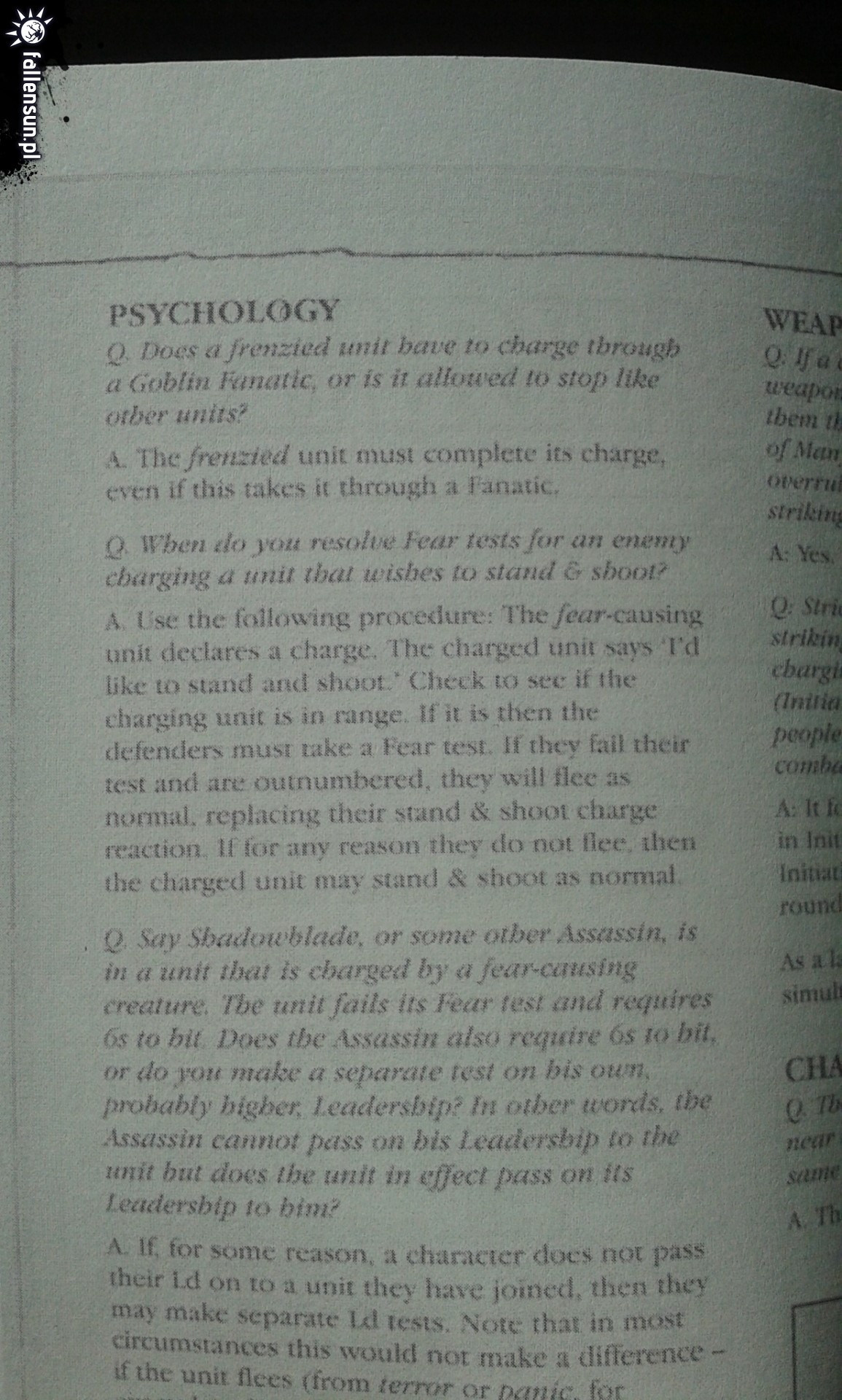 No kurczę - przeczytajcie feara. Po deklaracji sprawdzasz zasieg. Jesli szarża jest w zasiegu robisz test. Jak jest zdany fight as normal czyli np. S&s. Jak nie i us mniejszy niz szarzujacego - flee pomimo wczesniejszej deklaracji s&s | |